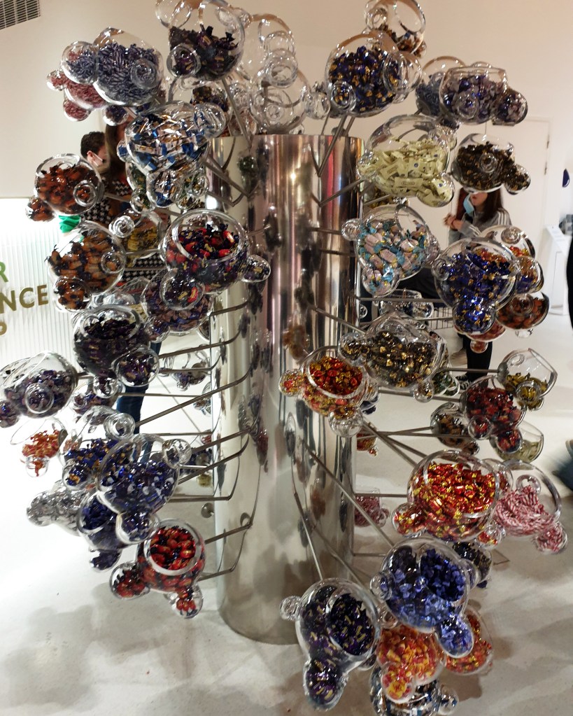 Wir bewunderten einen Nachhaltigkeitsbaum aus Plüsch-Tomaten und Plüsch-Petersilie, erriechten Schokoladen-Zusatzstoffe und bestaunten den Fazer-Osterhasen (er besteht aus vielen kleinen Fazer-Ostereiern, die aus der Schale eines Hühnerei bestehen und mit Nougat gefüllt sind – klingt crazy, oder?). Dann konnte die Schokoladen-Orgie beginnen. Eine Säule, an der viele halboffene Glaskugeln befestigt waren. In ihnen: Schokoladenpralinés in allen möglichen Varianten, mit Karamell und Salz, weiß und zartbitter, Mokka, Erdbeer, Blaubeer, Schokoriegel mit Waffeln, in der Crunchy-Edition oder mit Erdnuss.