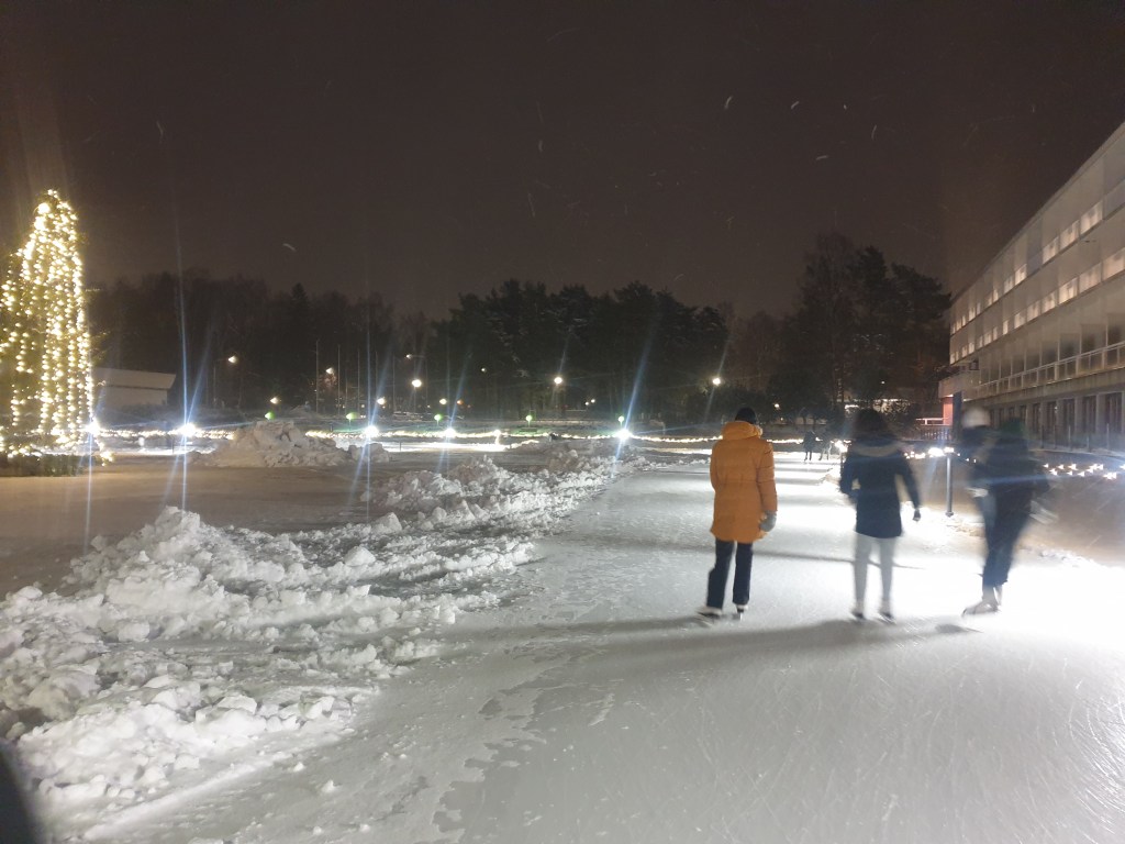 Bis jetzt, als ich im Tapiola Eispark diese Dinger in die Hand gedrückt bekam, fünf Euro Leihgebühr bezahlte und mich in die Fluten wagte. Die Eisfläche bestand aus einem Ring, der sich um einen großen, beleuchteten Tannenbaum zog, riesige Schneeberge markierten die äußeren Enden der Bahn. Im Gegensatz zu deutschen künstlichen Eisbahnen, die meist auf einer rechteckigen Fläche sehr eben und für Anfänger gut befahrbar sind, war die Eisfläche in Tapiola uneben und durchzogen von vielen Furchen, kleinen Hügeln, Schneetürmen.