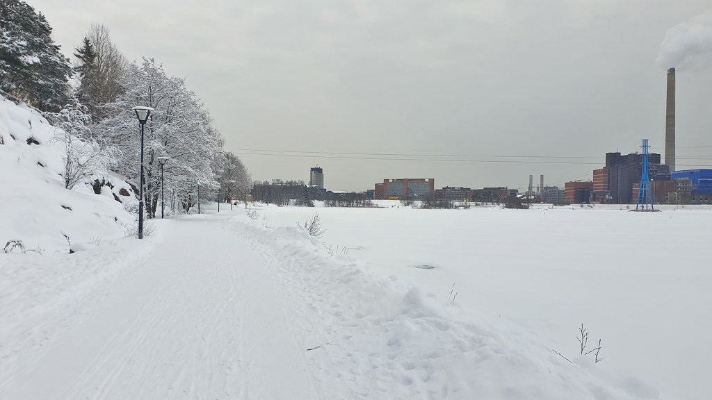 Also Watschelgang, ich habe nach drei Wochen in Helsinki ja Erfahrung damit. Pinguinwatscheln und Rennen gleichzeitig – da kommt eine seltsame Mischung aus Hinken, ganz kleinen tapsigen Schritten und viel Armarbeit zusammen. Das Gleichgewicht zu halten ist gar nicht so einfach. In Deutschland war ich nie laufen, wenn der Boden vereist war. Hier an der Bucht von Hietaniemi scheint es das Normalste der Welt zu sein.