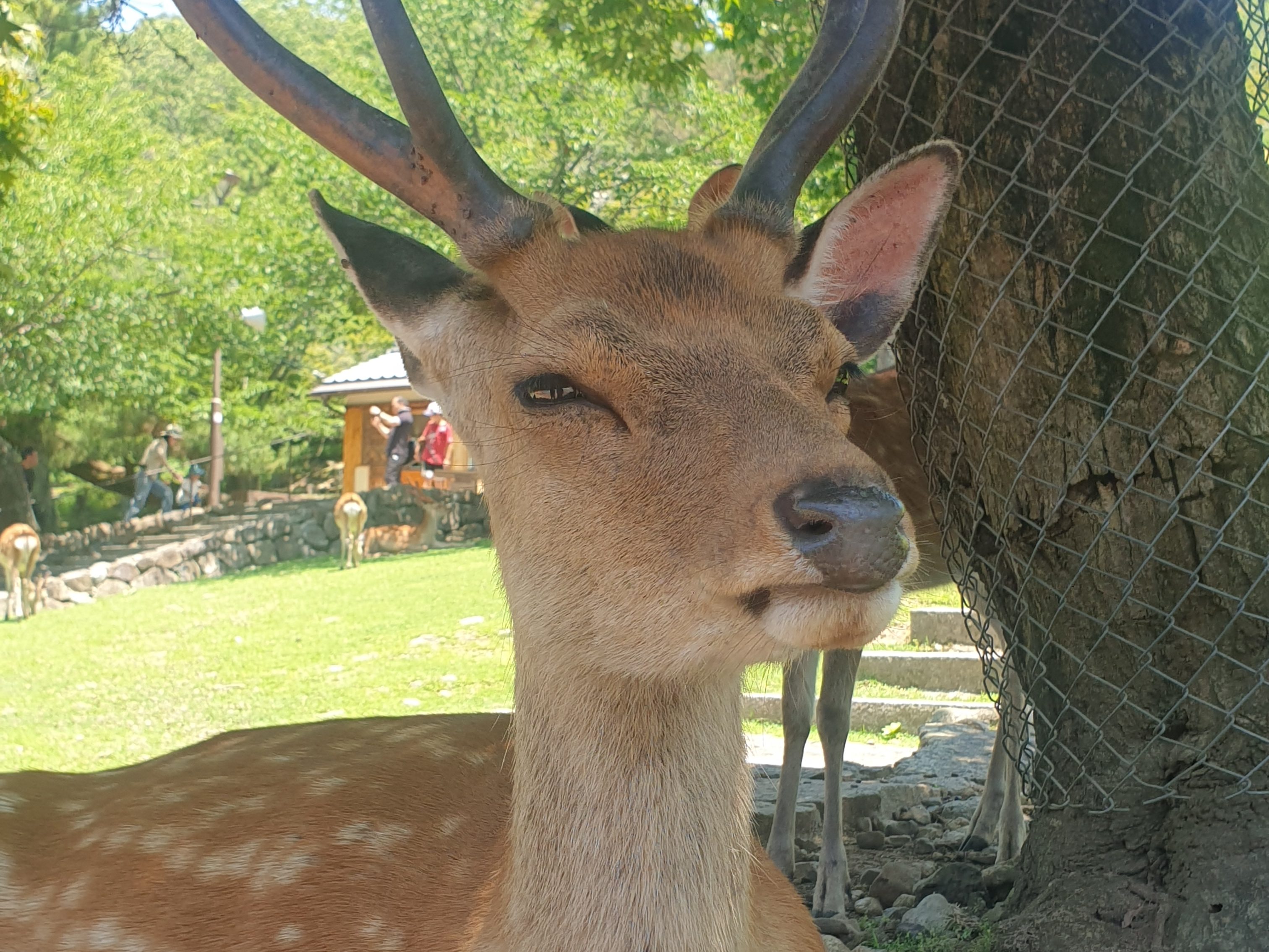 Von wegen ein, zwei Rehe. Auf der Parkfläche dahinter waren unzählige Rehe und Hirsche, alle zahm, manche lagen einfach nur da, andere ließen sich bereitwillig streicheln und an jeder Ecke wurden für 200 Yen Kekse für die Rehe verkauft. Natürlich eine reine Touristen-Attraktion. Weiß auch nicht, wie toll ich das finden soll, wenn die Tiere, die hier schon seit über Tausend Jahren beheimatet sind, sich jeden Tag nur von Reh-Keksen ernähren und von Kindern gestreichelt werden. Aber: Es funktioniert überraschend gut. Wir haben kein aggressives Tier gesehen und auch keine halben oder ganzen Wildunfälle (die große Straße läuft direkt daneben).