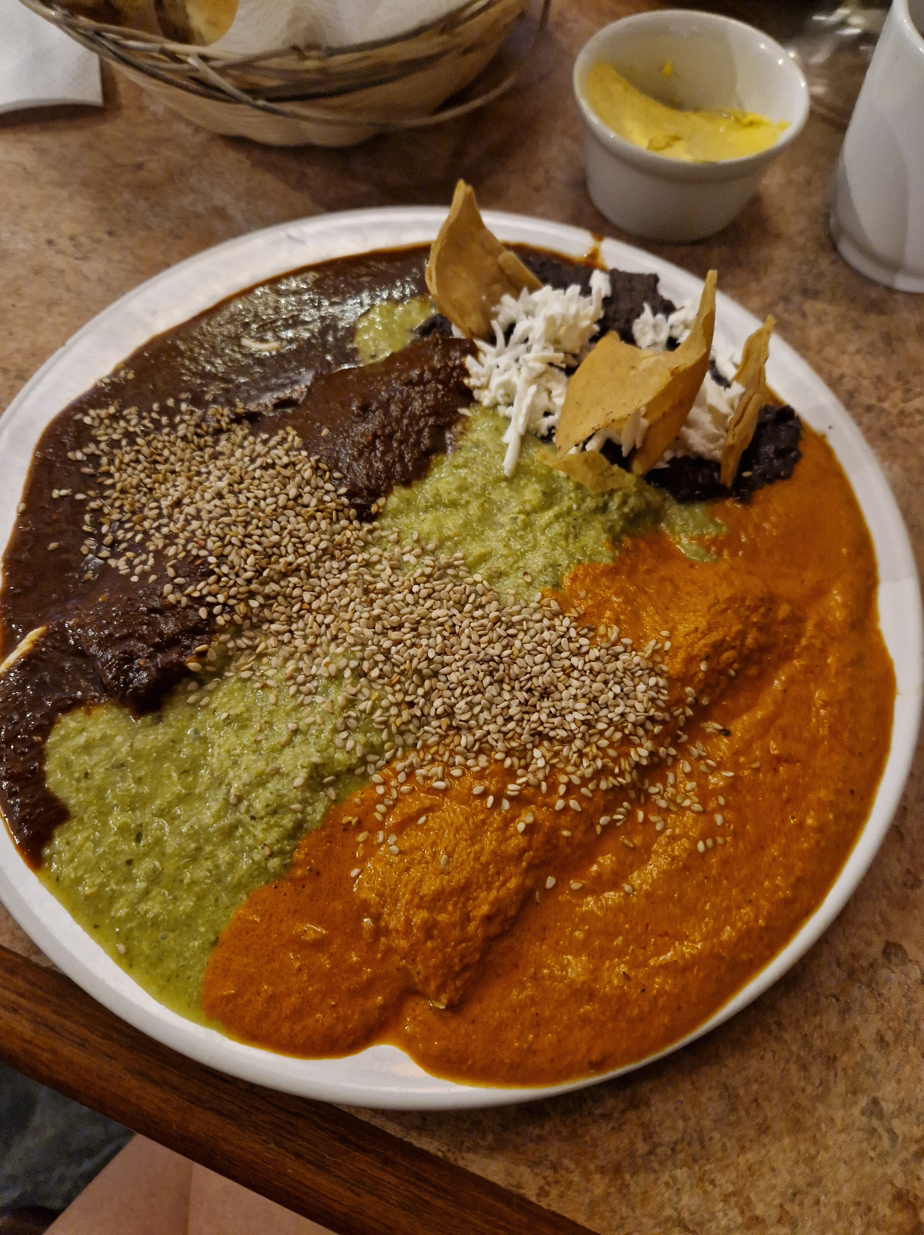 Dafür mag ich die scharfen Soßen hier in Mexiko sehr gern. Zum Abendessen waren wir in einem vegetarischen Restaurant (es gibt echt wenige davon in Puebla und wohl auch in ganz Mexiko). Hier habe ich Enchiladas mit einer Käsefüllung und viel Molé gegessen, also Soße in grün, rot (ich tippe auf eine Art Chilisoße) und braun. Aber genug über Essen geredet.