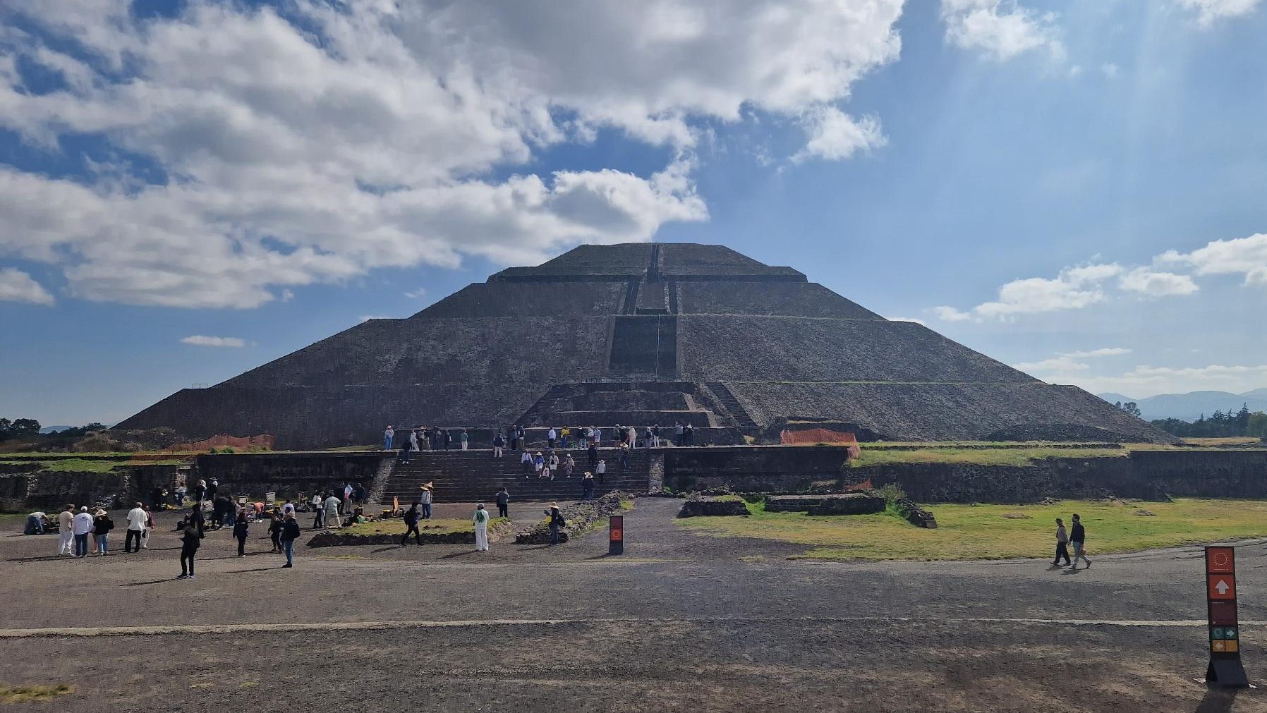 Die bekannteste Pyramide in Teotihuacan ist die Sonnenpyramide. Sie ist die drittgrößte Pyramide der Welt. Laut unseres Guides ist sie etwa 600 Jahre v. Chr. gebaut worden und besteht vor allem aus Lehm und Basalt. Einige Teile wurden mit roter Farbe angestrichen, die man zum Teil auch heute noch sieht, und mit Tieren verziert. Zum Beispiel mit Schlangen oder Jaguars, von denen es damals viele dort gegeben haben soll. Bis vor kurzem konnte man auf die Pyramide steigen, sie ist gut erklimmbar, da sie überall Stufen hat. Als wir dort waren, durfte man die Pyramide aber nicht betreten. Es gibt ein Tunnelsystem unter der Sonnenpyramide, das aber nicht begehbar ist. Ich müsste noch einmal nachschauen, weshalb es die Tunnel gab. Je nach Guide und je nach Stätte waren die Infos anders.