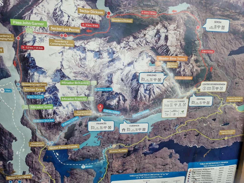 Warum also W und O? Im Torres-del-Paine-Nationalpark dreht sich vieles um die Türme. Beim O-Trek wandert man um die Torres einmal ganz herum, einen Kreis, wie ein O also. Beim W-Trek geht man in der Form eines geschwungenen W (oder wie Nicole sagt: Es sieht aus, wie zwei Brüste). Auf dieser Karte hier sind die beiden Wege gut zu erkennen, rot der O-Trek, orange der W-Trek. Den W-Trek kann man an vier oder fünf Tagen meistern (mit drei oder vier Übernachtungen). Es gibt nur an bestimmten Punkten Übernachtungsmöglichkeiten in Zelten und Schlafsälen, selten auch Hotels. Wir hatten, da wir so spät buchten, keine andere Wahl als drei Übernachtungen.