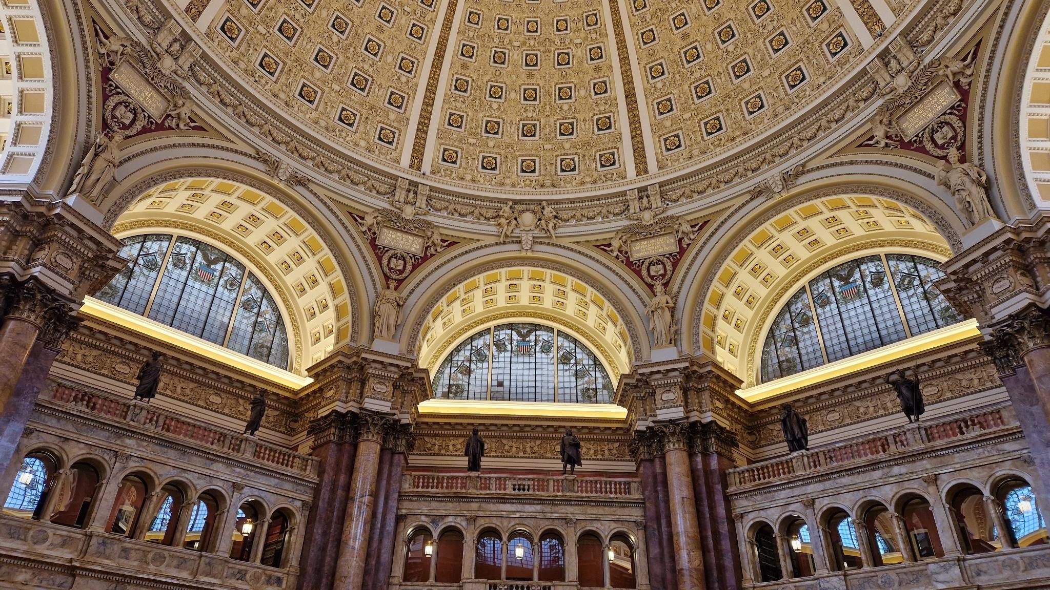 Egal. Es gab ja noch andere beeindruckende Gebäude in Washington, die ich bestaunen durfte, zum Beispiel die Library of Congress. Sie ist eine der größten Bibliotheken der Welt mit 173 Millionen Inhalten und knapp 3000 Mitarbeitenden (laut Wikipedia) und vor allem auf Jura spezialisiert. Lustigerweise ist der Teil der Bibliothek, in den sich die Menschen drängen, ultraklein. Man bekommt einen Sticker, geht eine Runde durch, bestaunt neben den vielen Schreibtischen mit Lampen darauf die hohen Decken, großen Fenster, die Marmorpfahle und Deckengemälde. Dann war es das auch schon wieder. Auch eine der ersten Luther-Bibeln steht in der Library of Congress, genauer gesagt: eine von nur drei erhaltenen Luther-Bibeln, die auf Vellum gedruckt wurden, einem feinen Pergament.